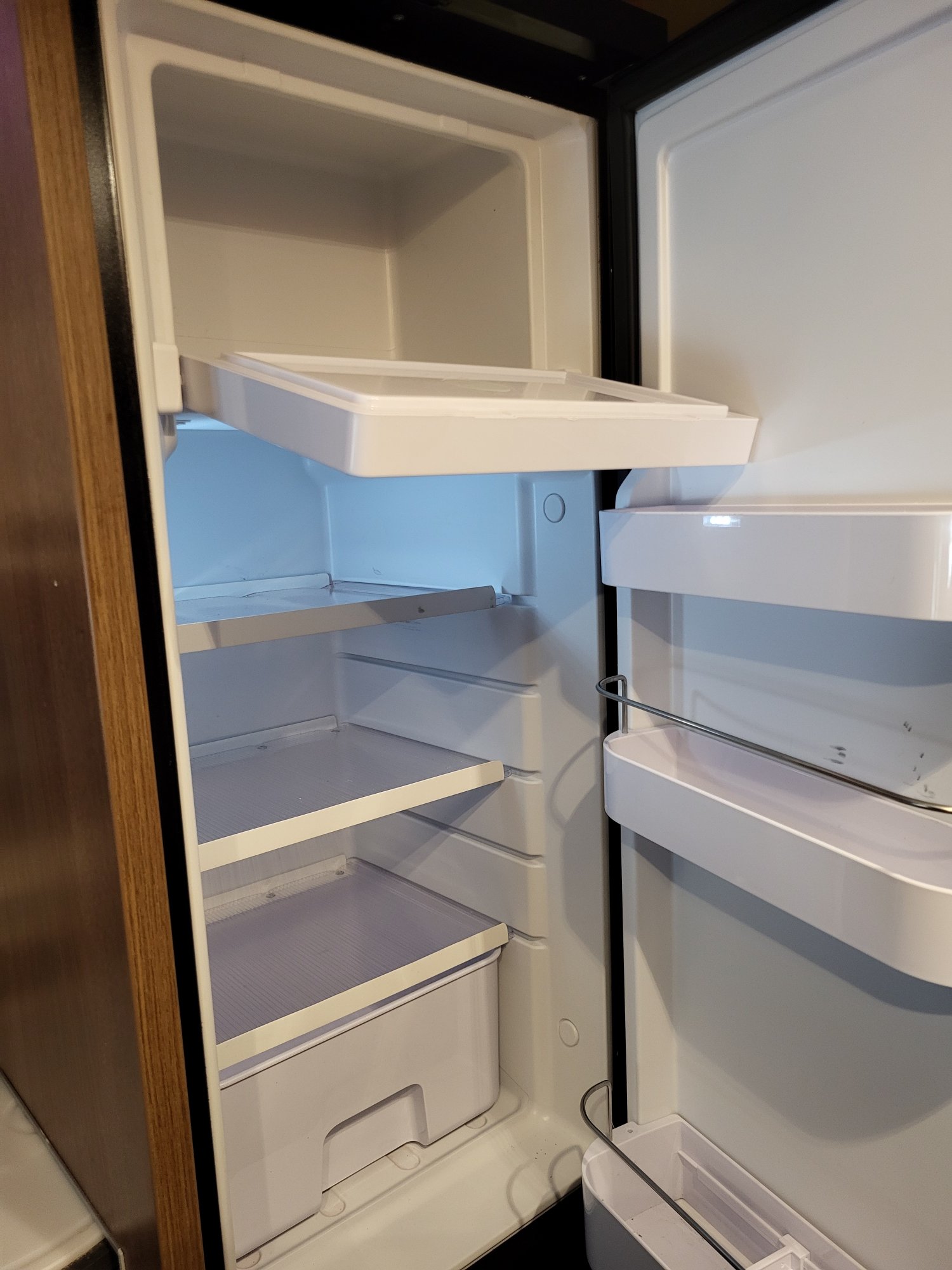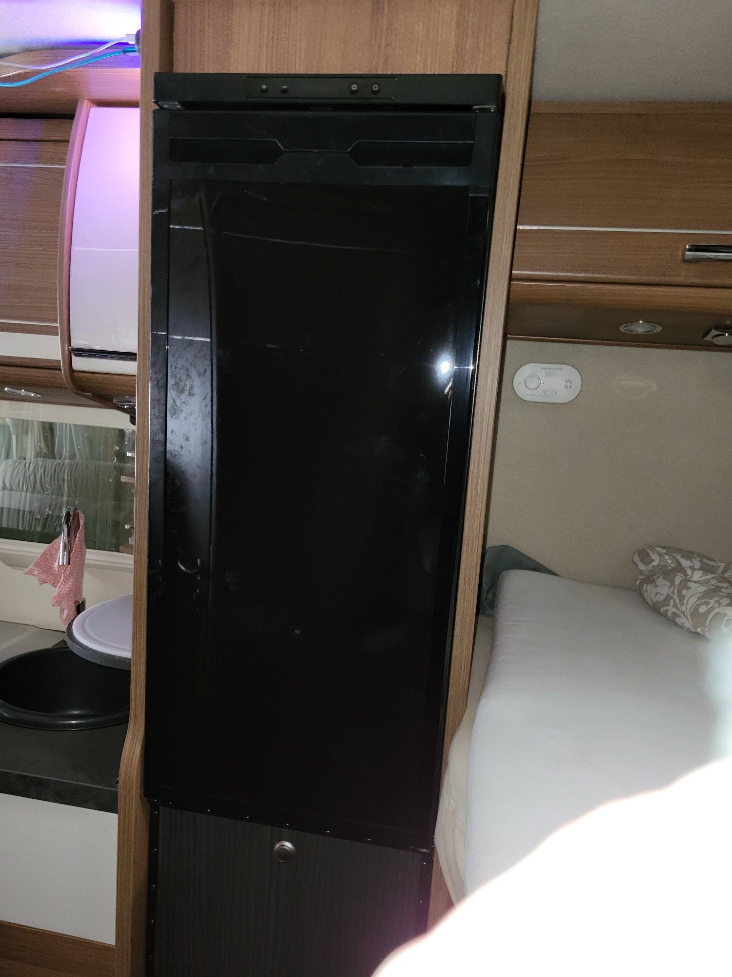 Yes it is an upright (Alpicool CR90X, cost me £216). It has a small freezer compartment, three shelves and a hydrator drawer. My previous absorption fridge Dometic RM9555. This was taller having four shelves and had a slightly larger freezer compartment. Unfortunately Alpicool don't do a fridge of the same height dimension. I decided to accept the slightly shorter fridge and added a raised shelf to mount the new fridge so the top was at the same height. This provided an extra locker underneath (about 320mm tall) which I use to store the electric kettle, toaster and air fryer.