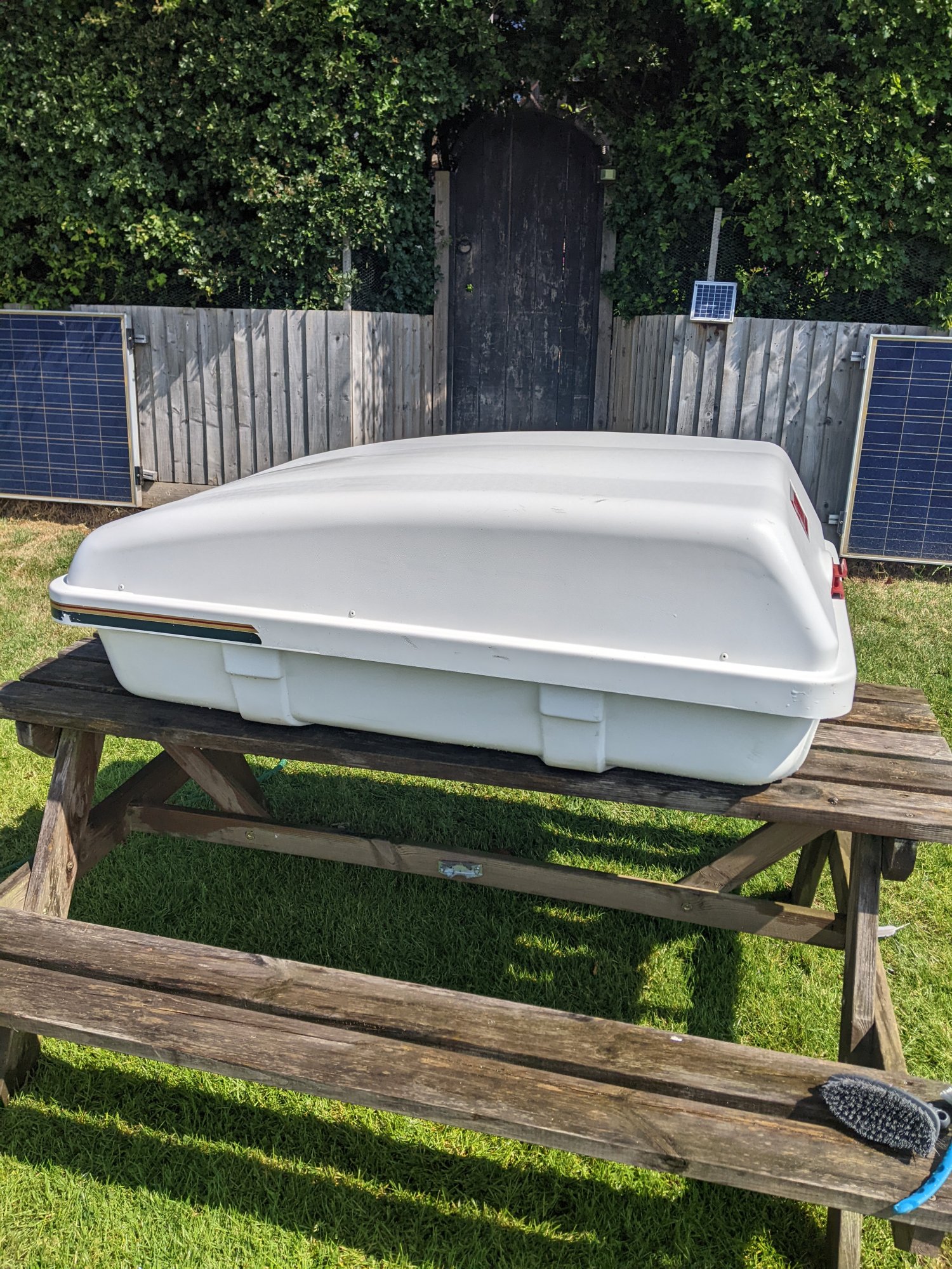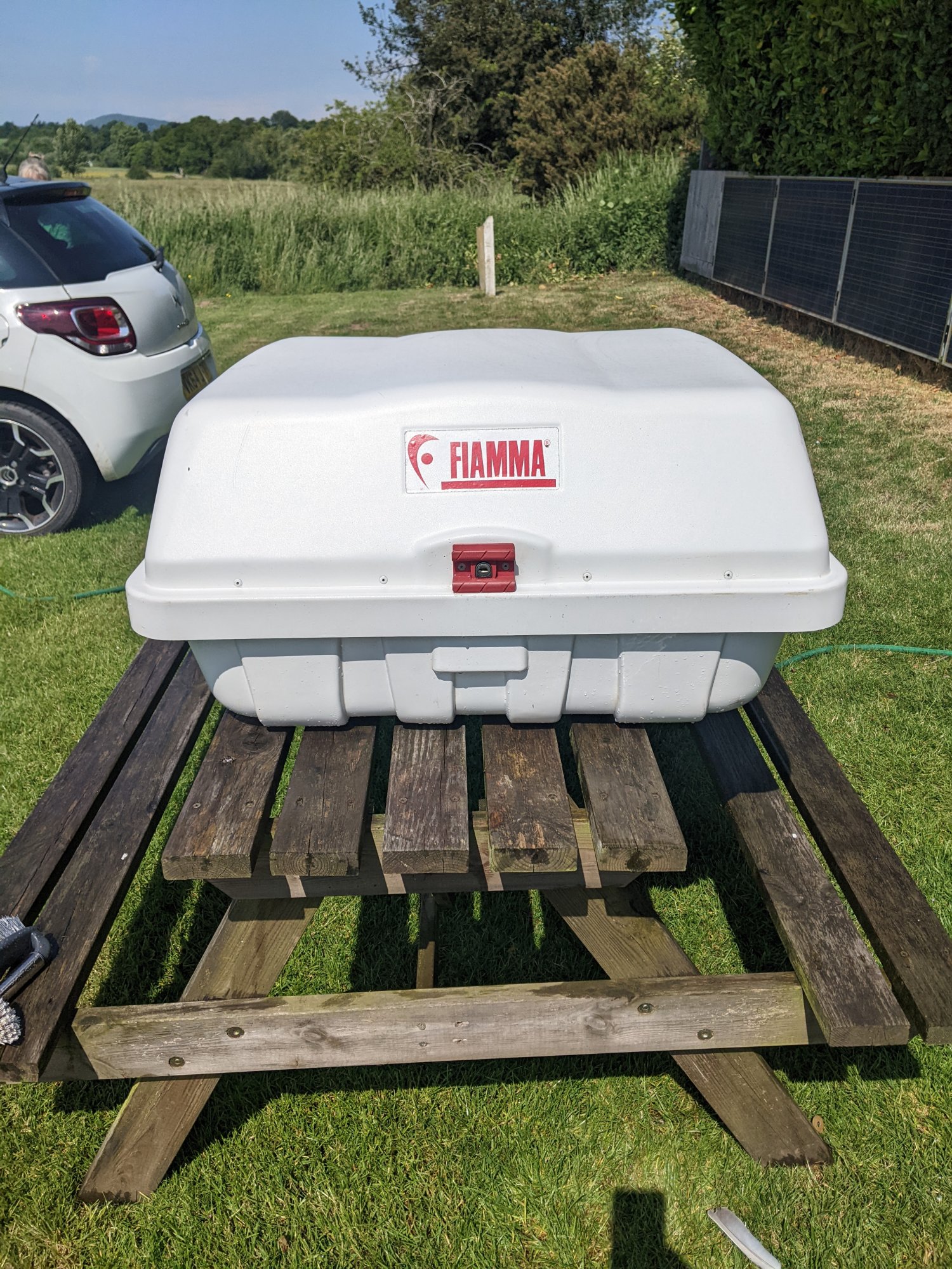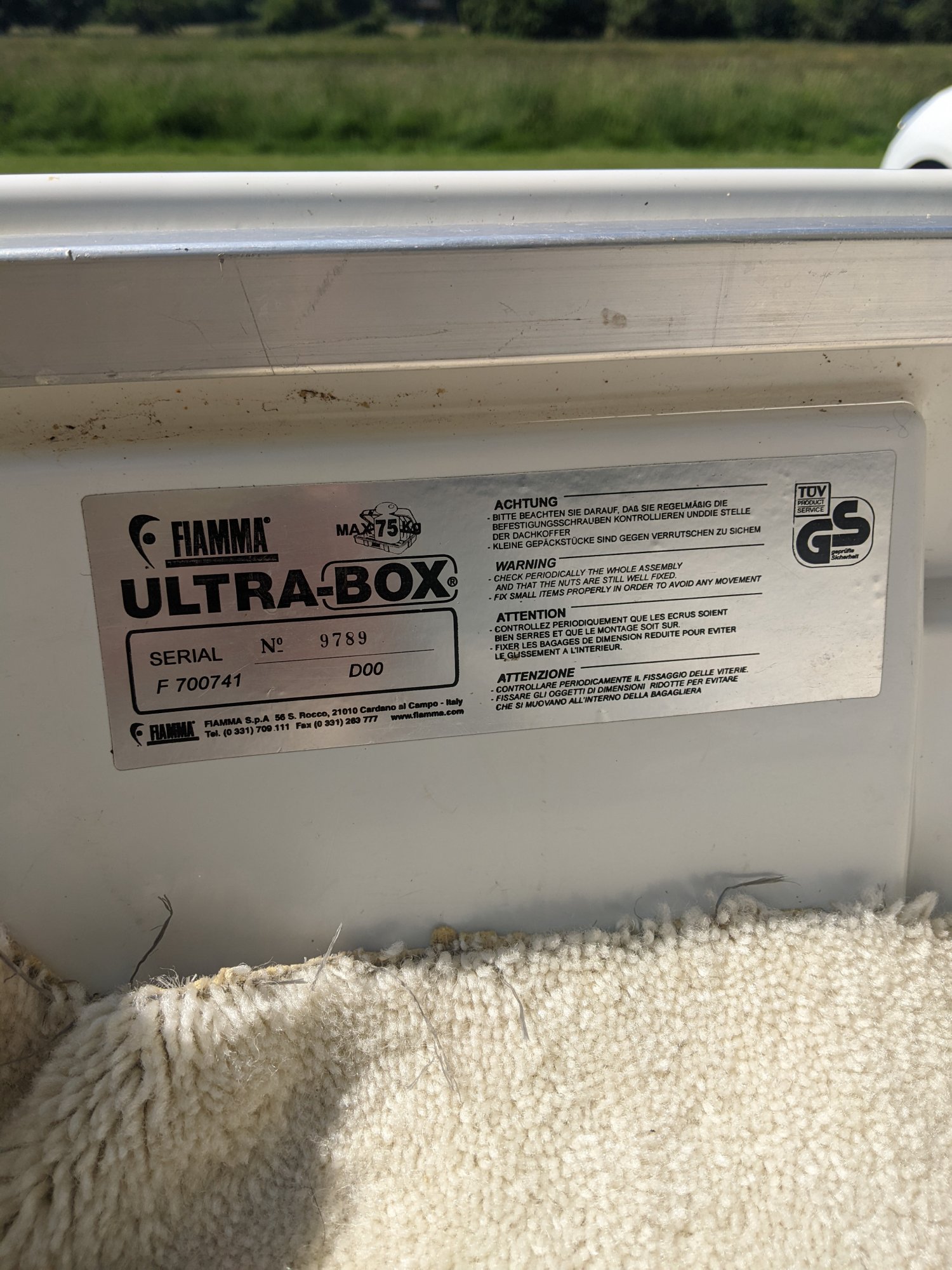 Fiamma Ultrabox. Unusual as it is front hinged and not side, so easy to access from a rear mount ladder.