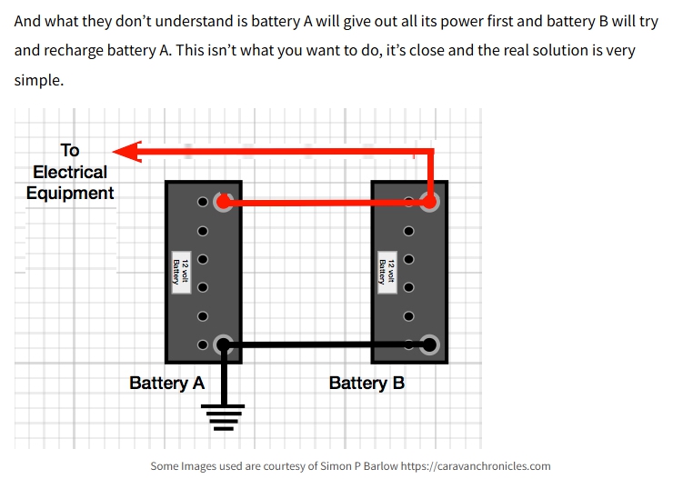 Technically the link cables only need to be 50% of the capacity of the main feed, ( because they'll be carrying 50% of the total current) . Your main feed looks like 10mm so anything over a paltry 5mm will suffice. What we go for will depend on how much future proofing you want to build in, we can discuss that.....along with quite a lot more.This is how I understood it should work up thread. The first one is wrong as it will cause the first battery to discharge quicker I think and the second one will try and then charge the first one. I think you have to wire the positive feed to one battery and then the negative to the other to in effect create one battery from the two and you need to do the same with anything that is connected to it so the positive of say a 12v socket goes to one battery but the negative goes to the other. What I need to know is what cables are required for connecting the two batteries inbetween. I think I have this right but my heads a bit fuzzy this morning.
