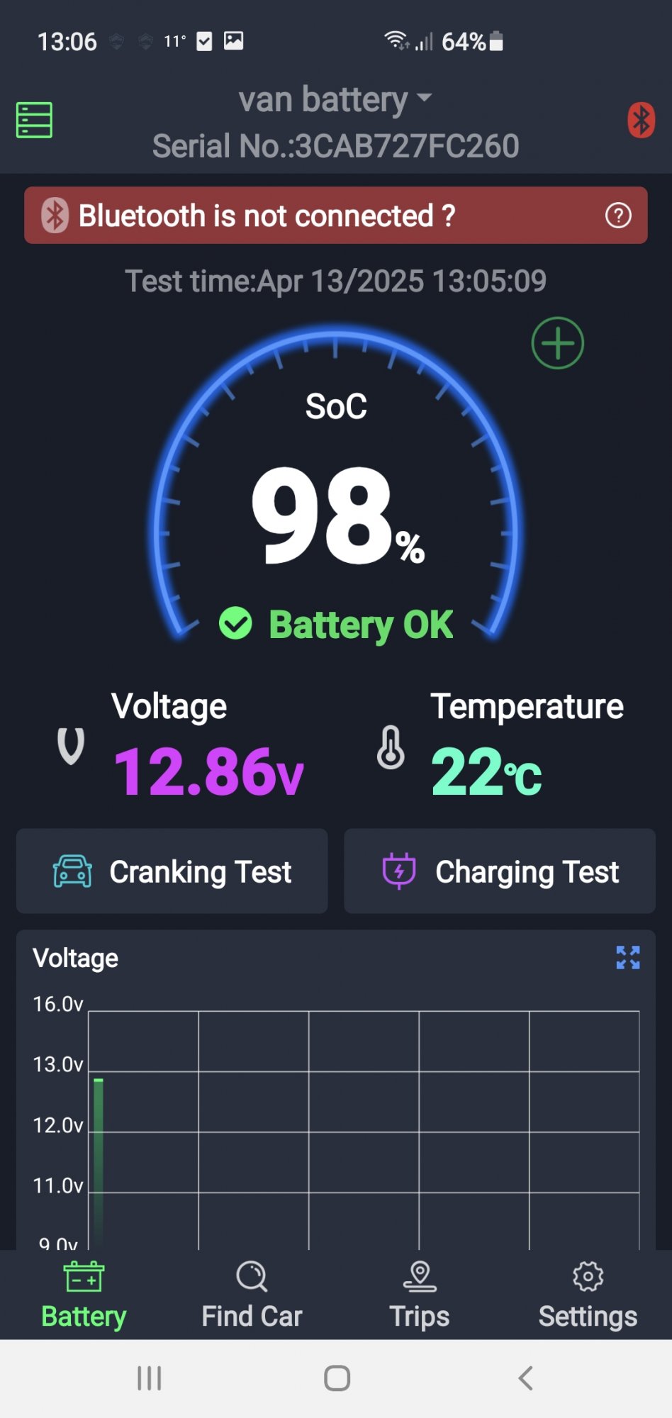 If you look carefully you can see the voltage dropping overnight and flattening off during the daytime due to temperature changes.The VB seems to be fine, no charge gone in for 3 days and it's remaining steady.