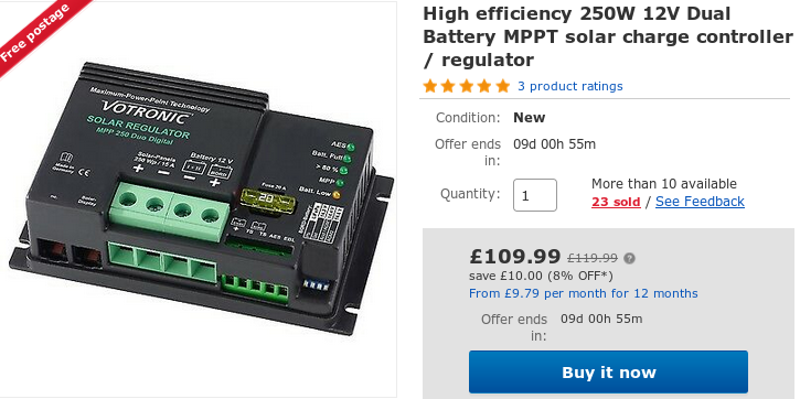 I originally suggested it was worth paying an extra £20 to get the Victron 5yr guarantee but thinking about it Peter needs the hassle of learning to use his first smartphone in order to programme and update his charge controller and sit watching his charge current going up and down about as much as he needs a broken leg.