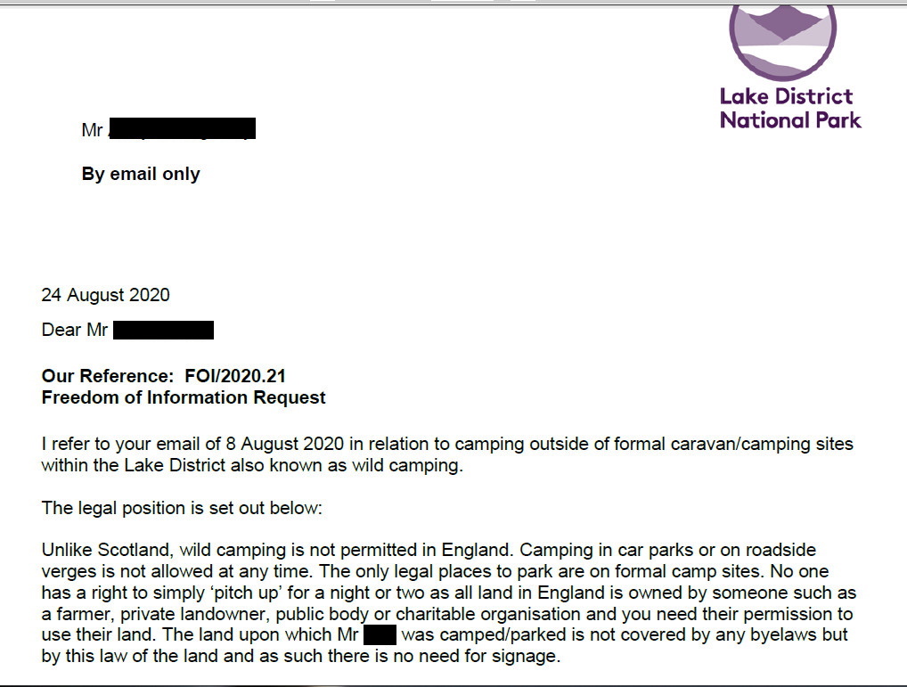 The FoI number is there if anyone wanted to question the authority further. They took 16 days to look up the accurate answer. There’s no byelaw but it’s the law of the land. Unspecified law of the land. Formal campsites only. Move when we tell you. You'll never know the byelaw doesn't exist, will you?