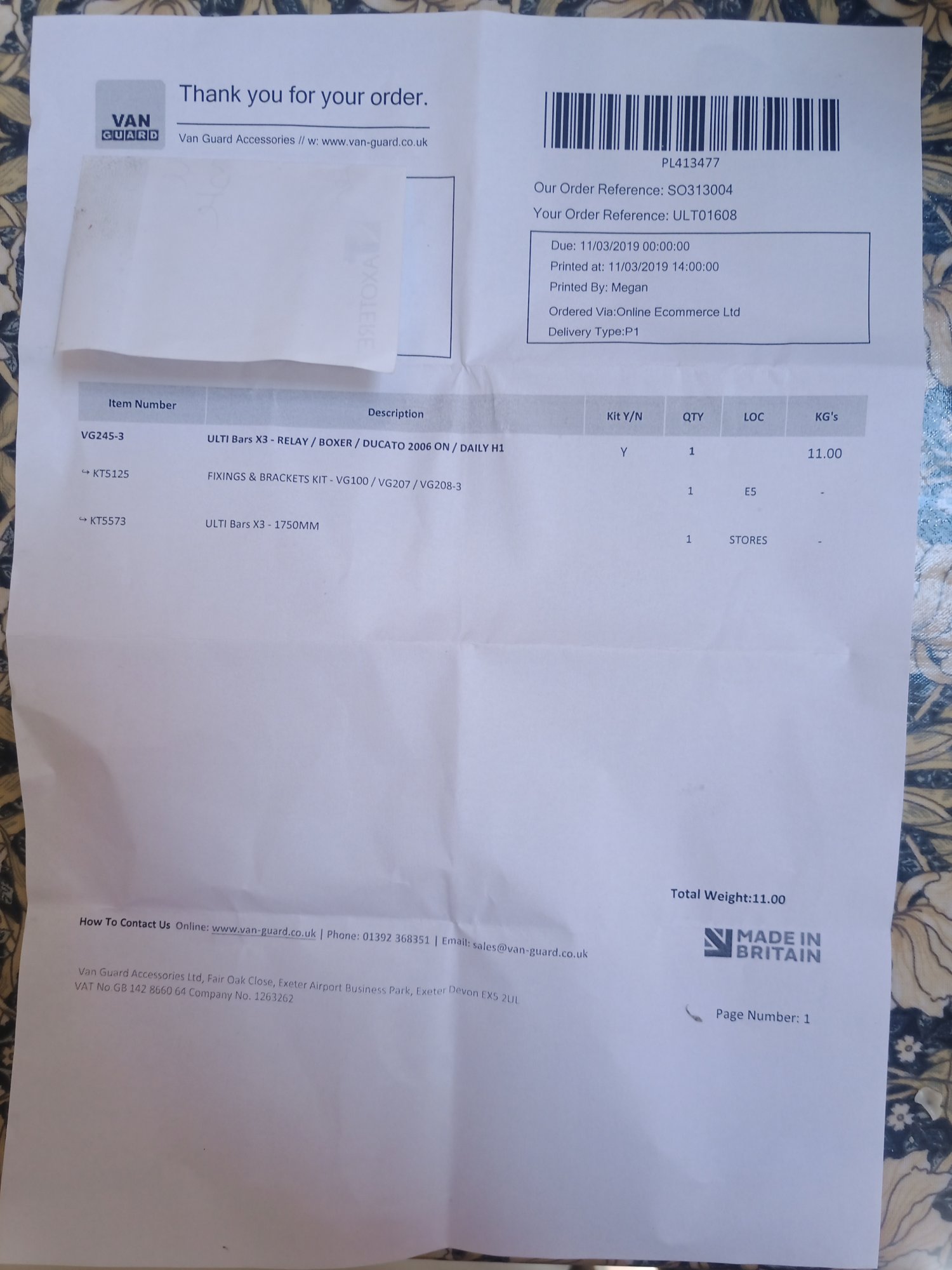 Dimensions: Cross-members (mm) L x W x D = 1750 x 60 x 30. Weight: 9kg. Each individual ULTI Bar has been tested up to 80kg per bar. However for your van's actual load carrying capacity please always refer to your vehicle's handbook. Comes complete with galvanised powder coated steel brackets...