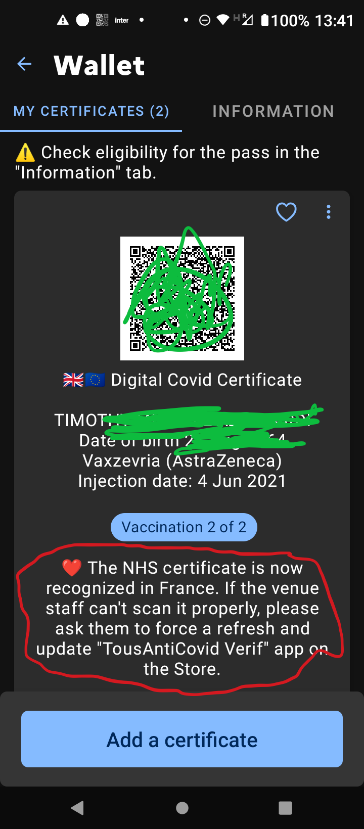 I'm in France, got my paper Scottish vaccination certificate in July (so no QR code). I took the Eurotunnel with the van 15th August. The french border police did not ask for my vaccination certificate, just my passport. Maybe I was just lucky. Whenever I have been asked for the "pass sanitaire" (in restaurants and bars) I show them my NHS Scotland vaccination certificate and proactively point out the words that are the same in French - "covid19" "vaccination" "status" "AstraZeneca" "Dose 1" "Dose 2" and the two dates. Not had a problem so far, but I do speak enough french to say "bonjour" and "J'habite en Ecosse" which helps a lot. Small villages are very strict with masks and asking for the "pass sanitaire". However Montpellier city centre last Saturday night was like an open air night-club. Absolutely zero rules, tens of thousands of young adults in tiny streets, tiny bars. Like any other Saturday night from the past 50 years. Good natured caos! (Some people (30%?) might wear a mask going to the loo in the bars though)